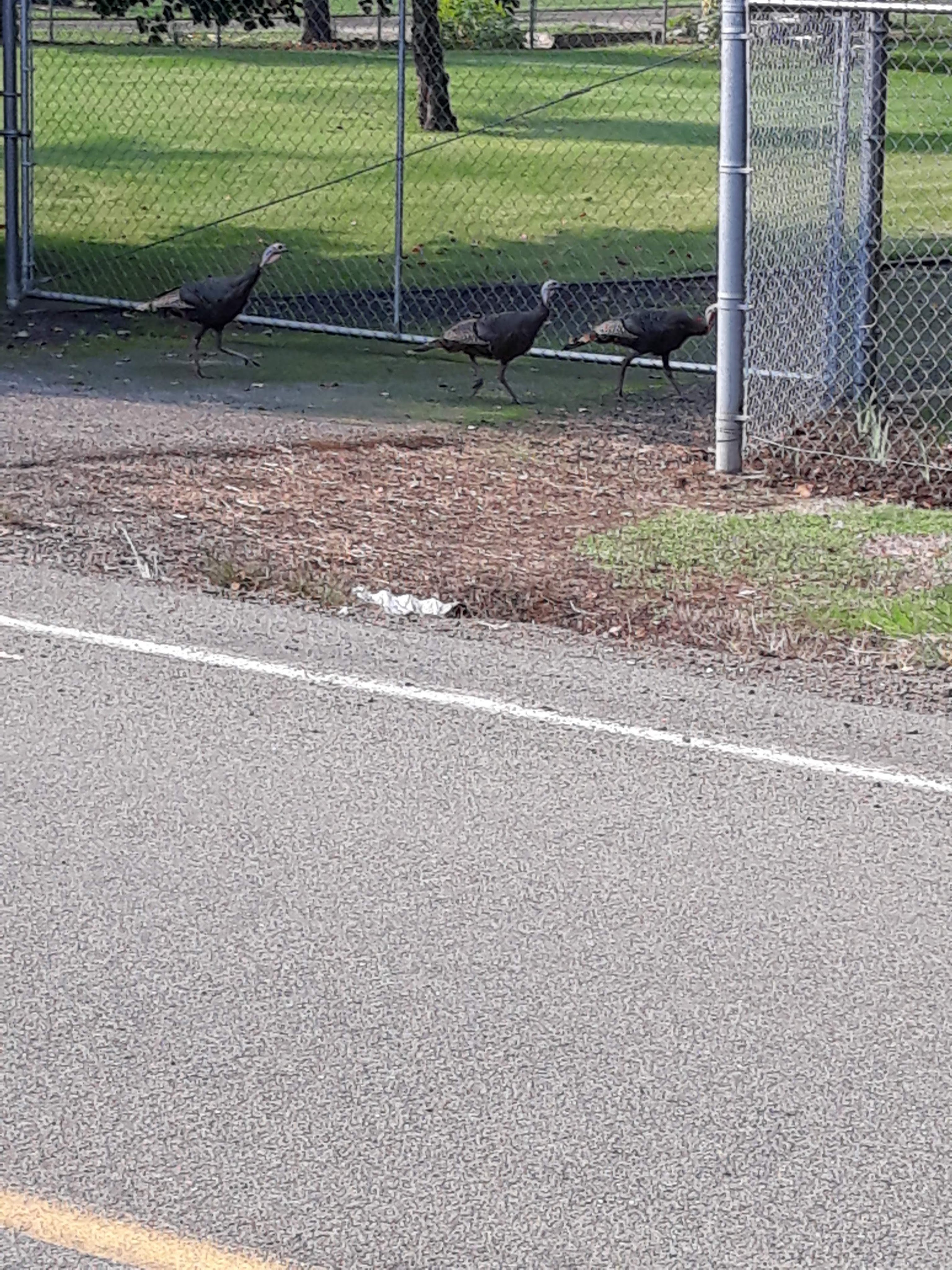 The funniest experience was when we spotted some wild turkeys on our morning walk. There were 6 of them and 3 had fallen behind and got stuck behind a fence. All they had to do was walk 2 feet to the right to rejoin their pals, but they couldn’t figure it out. So I walked closer and spooked them over where they went running like crazy wild turkeys on Wild Turkey. Merge the pics below to get the idea.