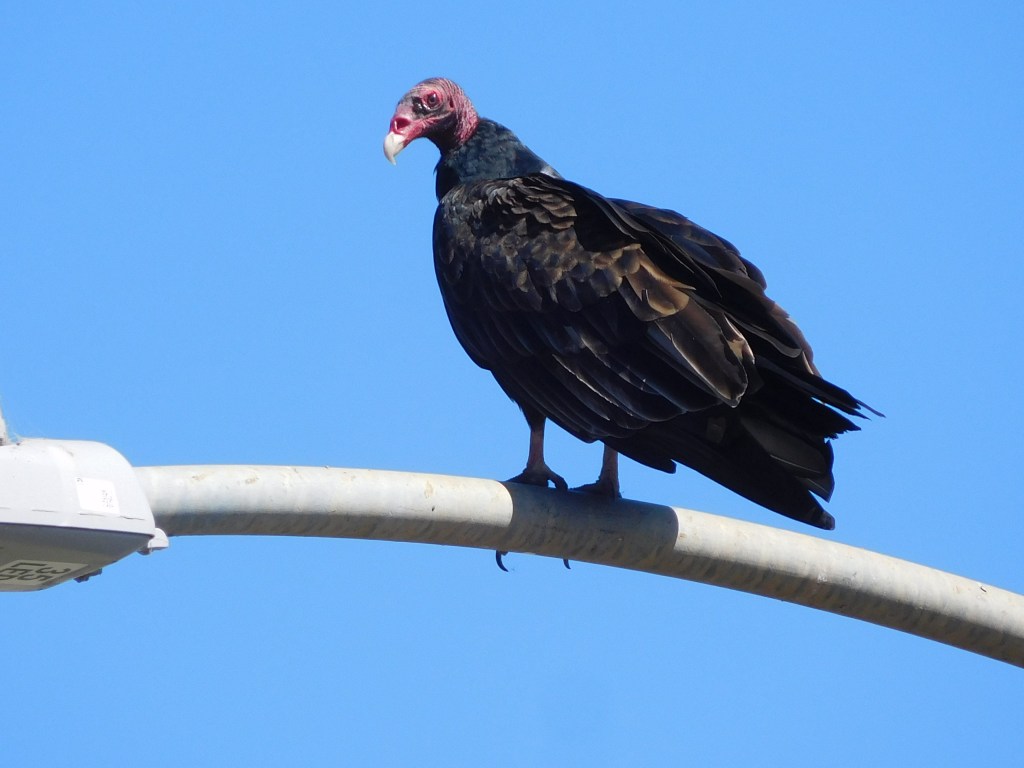 Spent 2 nights in Sunnyvale with Robin’s cousin, Don. Long drive from Roseburg. Don made us a great breakfast on Sunday morning. We took him out for dinner to the Duke of Edinburgh. We really enjoyed Don, his 2 cats, Leo and Miller and relaxing on his patio. We had an enjoyable walk to the Sunnyvale Community Center. We saw a Turkey vulture on a lamppost along the way.